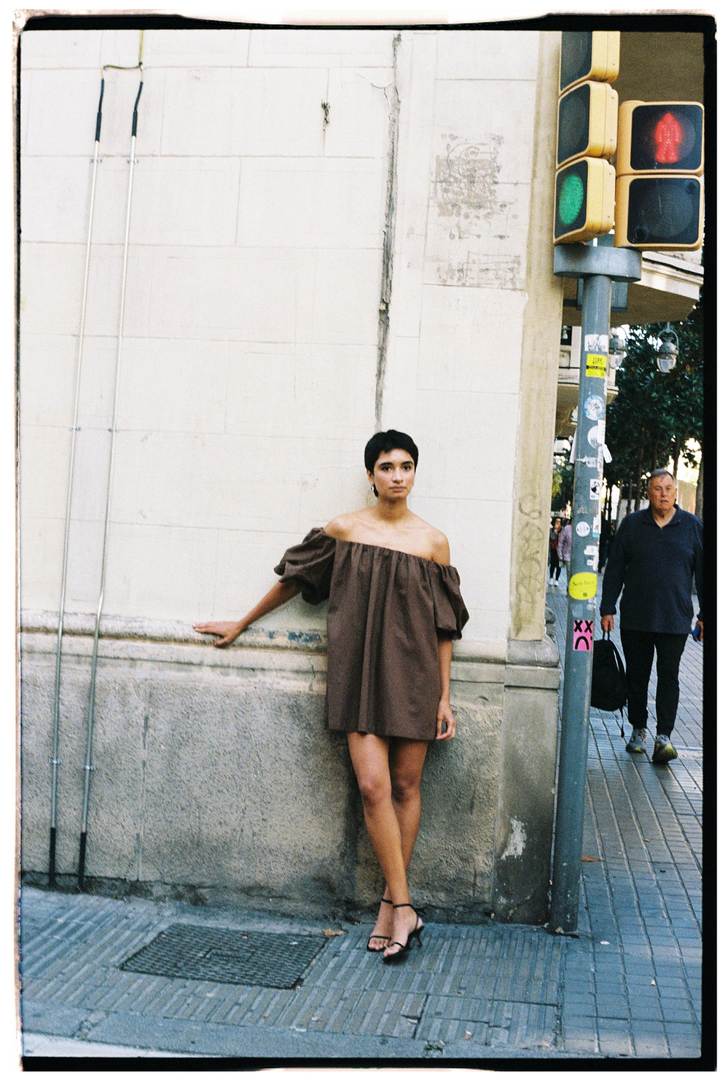 Su género es de lino y algodón. De hombros descubiertos, lleva un elástico en la parte superior y mangas con una molderia increíble.